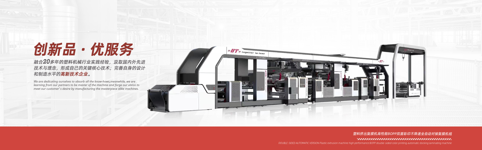 優(yōu)特機械精心致力于塑料編織行業(yè)、紙塑軟包裝行業(yè)、輪胎制造行業(yè)等成套生產(chǎn)設備的設計和制造,并為用戶提供生產(chǎn)工藝及培訓。我們的服務范圍包括各類塑料覆膜機、紙張覆膜機、BOPP彩印膜雙面自動對版覆膜機、 紙塑邊縫三合一覆膜機、中縫印刷制袋機、以及輪胎行業(yè)循環(huán)回收使用的隔離膜生產(chǎn)線。